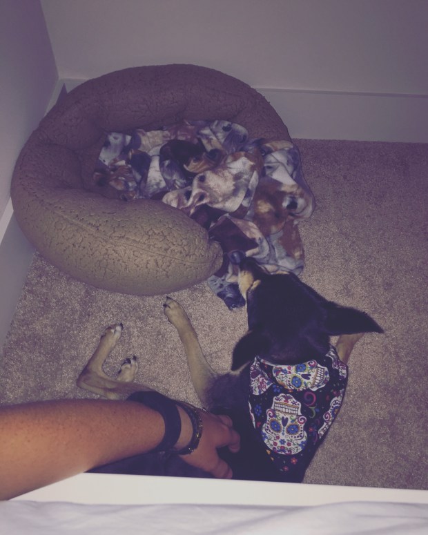 We are watching Olive this weekend. She wants nothing more than to sleep as close as possible, even sacrificing her own bed.